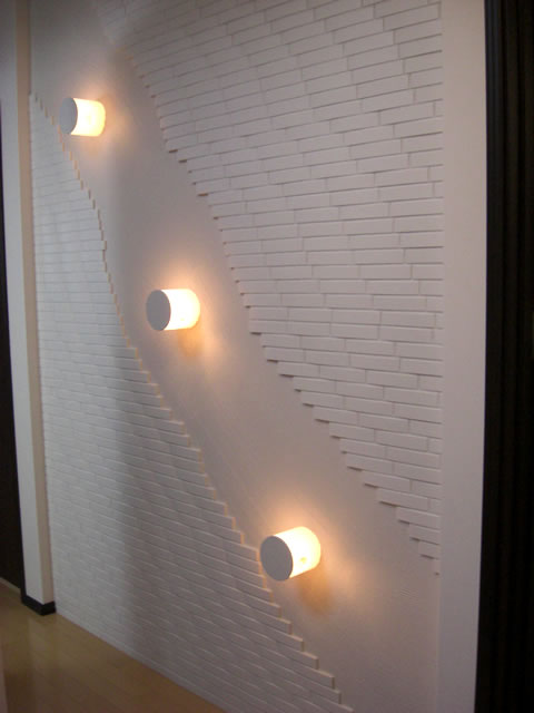【左官・タイル工事等】玄関ホールに壁面造作はいかがですか?何でもない壁が、タイル・左官・タイル工事に間接照明を加えました。弊社の最も得意とする造作の一つです。