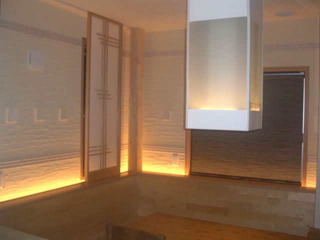 【左官・タイル工事等】間接照明のご提案も弊社の得意とする施工の一つです。お住まいに合わせた最高のご提案をさせていただきます。ちなみにこれは壁を波うたせ、そこにタイルを貼りました。